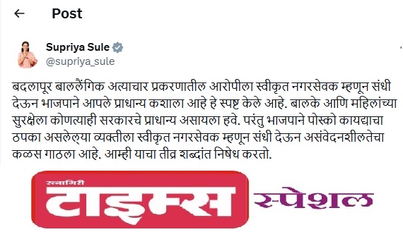 राष्ट्रवादी काँग्रेस शरद पवार गटाच्या नेत्या आणि खासदार सुप्रिया सुळे यांनी भाजपावर चांगलाच निशाणा साधला आहे. त्यांनी एक ट्वीट केले आहे. त्यात 'बदलापूर बाललैंगिक अत्याचार प्रकरणातील आरोपीला स्वीकृत नगरसेवक म्हणून संधी देऊन भाजपाने आपले प्राधान्य कशाला आहे हे स्पष्ट केले आहे. बालके आणि महिलांच्या सुरक्षेला कोणत्याही सरकारचे प्राधान्य असायला हवे. परंतु भाजपाने पोस्को कायद्याचा ठपका असलेल्या व्यक्तीला स्वीकृत नगरसेवक म्हणून संधी देऊन असंवेदनशीलतेचा कळस गाठला आहे. आम्ही याचा तीव्र शब्दांत निषेध करतो.' असं त्यांनी म्हटलं आहे.